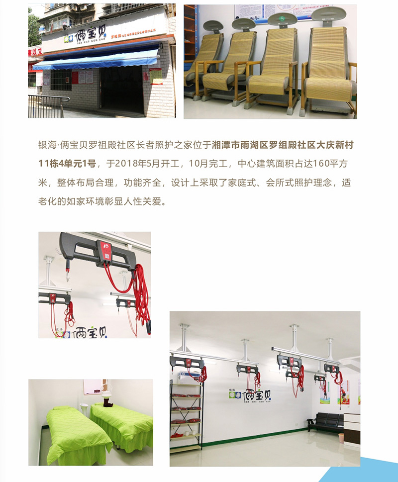 銀?!z寶貝羅祖殿社區(qū)長(zhǎng)者照護(hù)之家位于湘潭市雨湖區(qū)羅組殿社區(qū)大慶新村11棟4單元1號(hào),于2018年5月開工,10月完工,中心建筑面積占達(dá)160平方米,整體布局合理,功能齊全,設(shè)計(jì)上采取了家庭式、會(huì)所式照護(hù)理念,適老化的如家環(huán)境彰顯人性關(guān)愛。