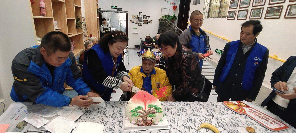 與此同時,湖南老兵之家的志愿者們提著大壽桃狀的蛋糕,來到了爺爺房間!一起為爺爺唱生日歌、吃蛋糕,其樂融融,每個人的臉上都露出了開心的笑容,一個接一個和我們的壽星百歲爺爺合照沾喜氣!正是因為有像李紹杰爺爺這樣的老兵為我們幸福平安的生活做出了巨大貢獻,我們才能生活得如此安定。我們不會也不該忘記他們曾經遭受過的苦難,我們希望他們能在銀海倆寶貝幸福、安詳的度過晚年!祝爺爺健康長壽!
