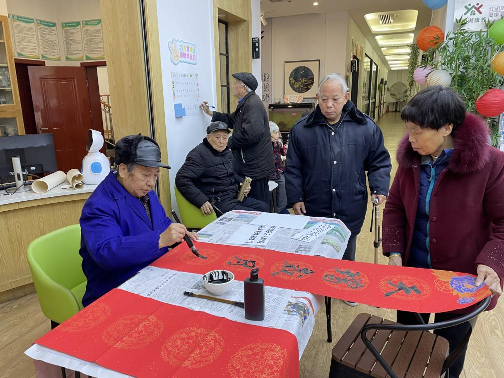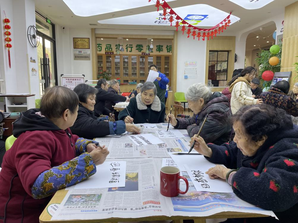 活動(dòng)中,在工作人員的協(xié)助下爺爺奶奶們熱情高漲,先是提筆練習(xí),然后埋頭揮毫,現(xiàn)場(chǎng)提筆蘸墨的、忙著晾曬的,濃濃的墨香里洋溢著新年的喜悅,整個(gè)活動(dòng)室彌漫著濃濃的年味。