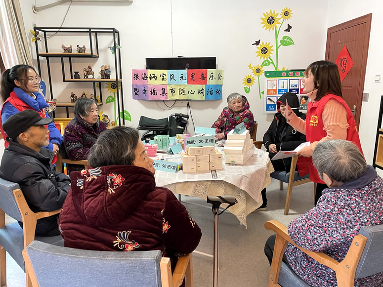 經(jīng)過一系列的比拼過后,每位爺爺奶奶都收獲到了不等的幸福幣,結(jié)合近期的活動出勤、興趣小組參與(遛鳥、養(yǎng)魚、澆花、擇菜等)、以及各類好人好事,爺爺奶奶們通過自己辛勤的勞動都拿到了相應(yīng)的“薪酬”。拿到工資的他們,認真挑選著自己需要的物品,集市上人群熙攘,熱鬧非凡。