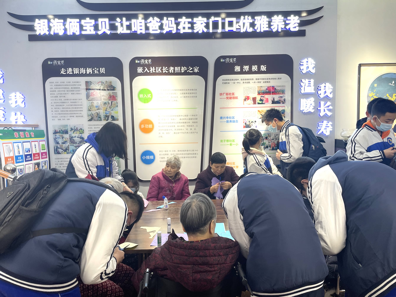 伴隨著激昂的音樂(lè)、一陣陣鏗鏘有力的歌聲從銀海倆寶貝窯灣康養(yǎng)中心傳出,白發(fā)蒼蒼的“80后、90后”與青春正好的“00后”開(kāi)啟了一段奇妙的碰撞。