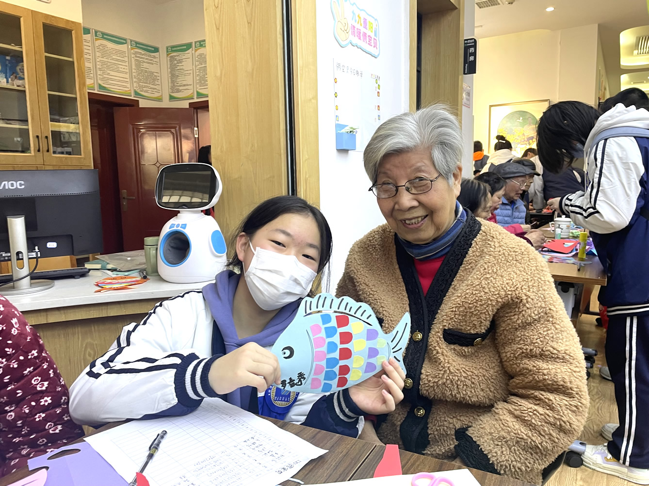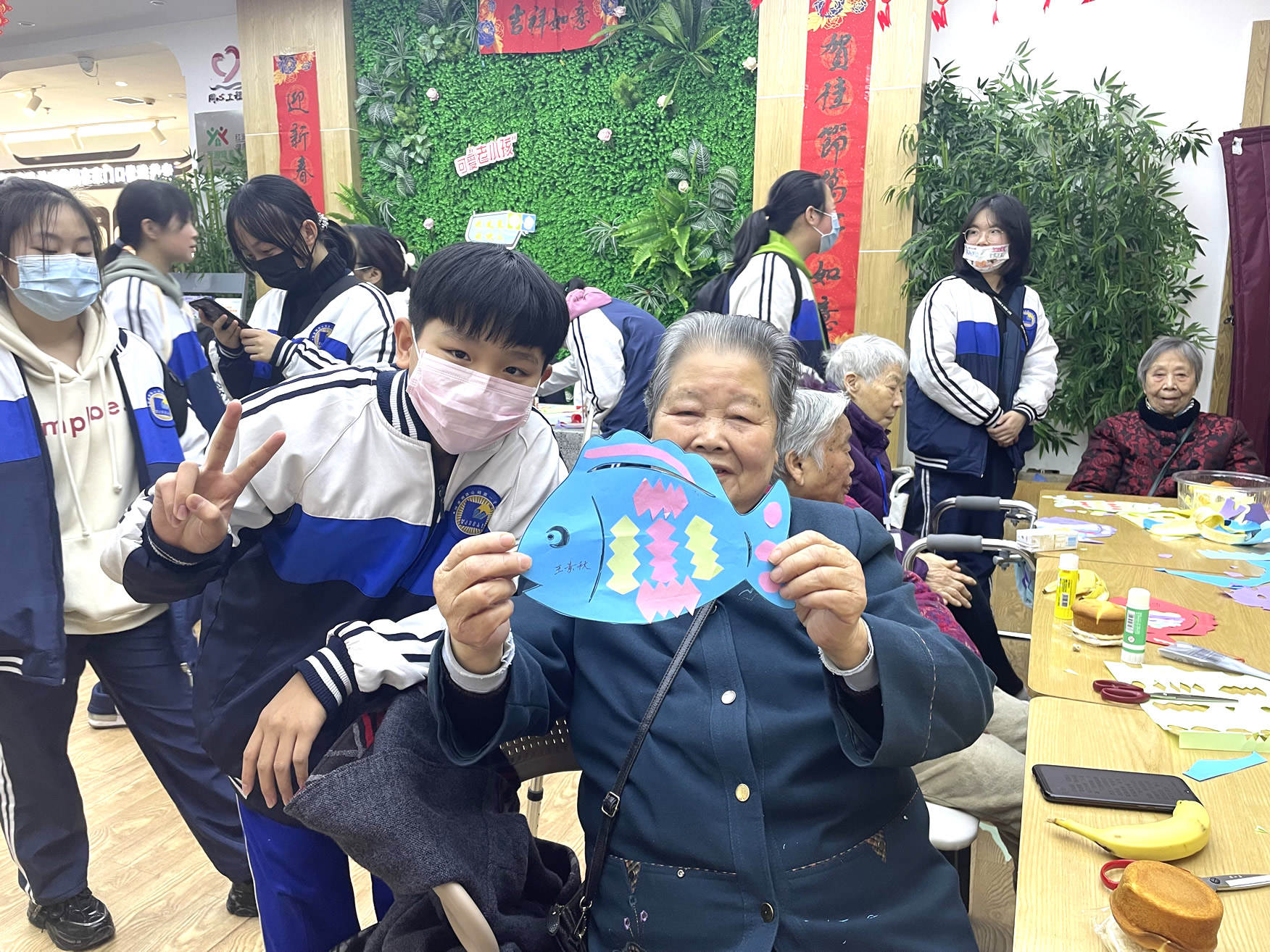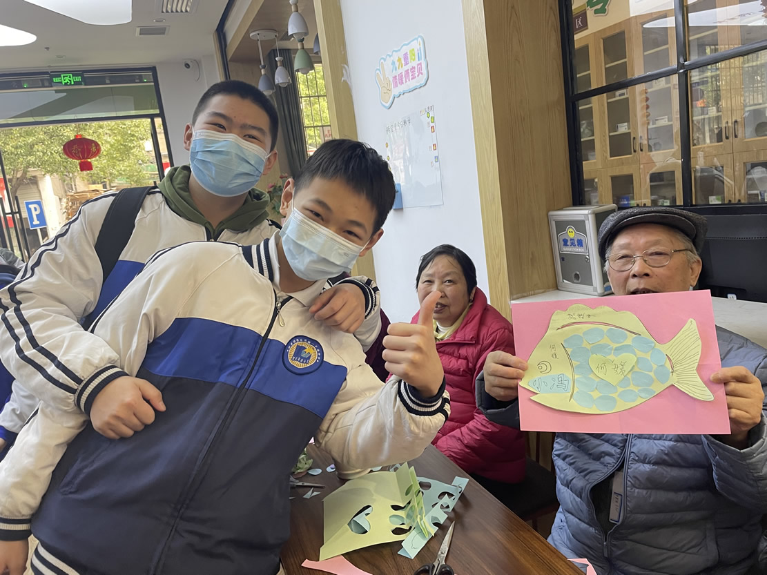 “爺爺奶奶們好!”還未瞧見(jiàn)人一聲聲清脆響亮的問(wèn)好聲便已傳了進(jìn)來(lái),在老師及工作人員的組織下同學(xué)們有序進(jìn)入到院內(nèi)并配合做好疫情防控登記。不一會(huì)兒,同學(xué)們陸續(xù)找到爺爺奶奶進(jìn)行自我介紹,并以一對(duì)一的形式來(lái)協(xié)助他們完成今天的手工作品“年年有魚(yú)”。