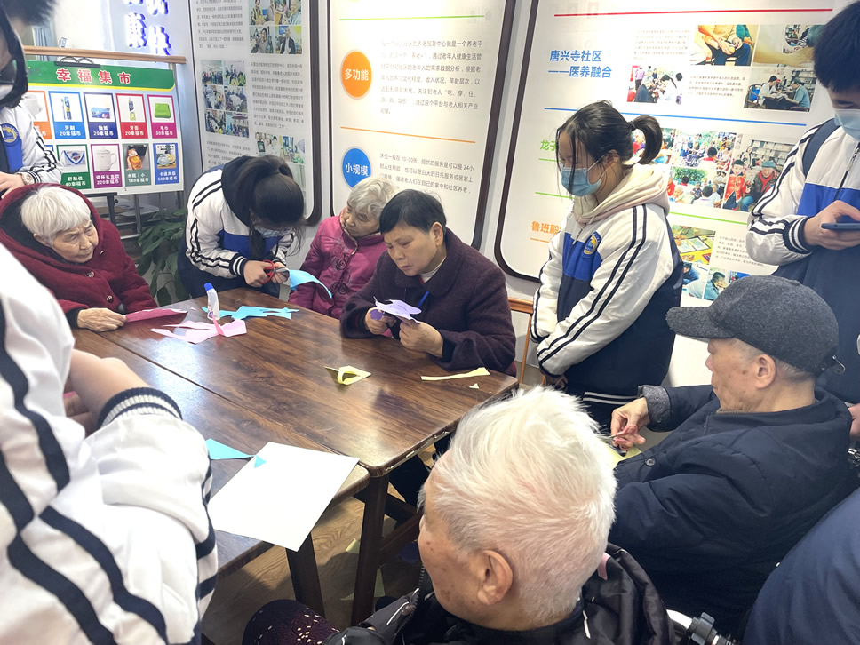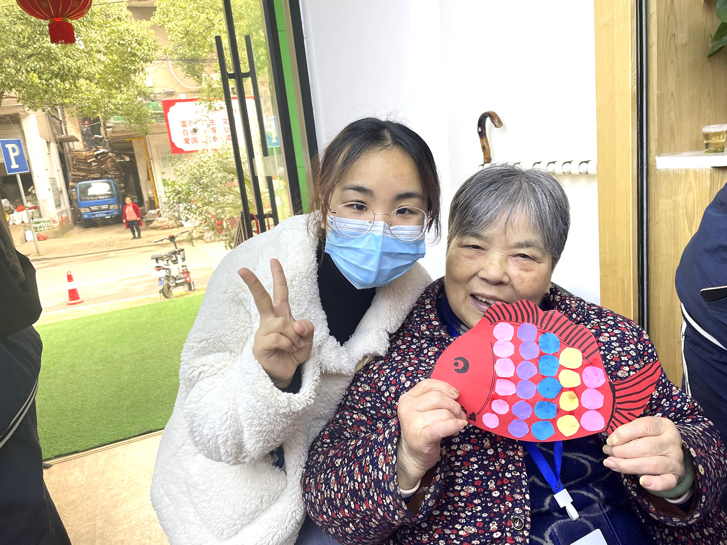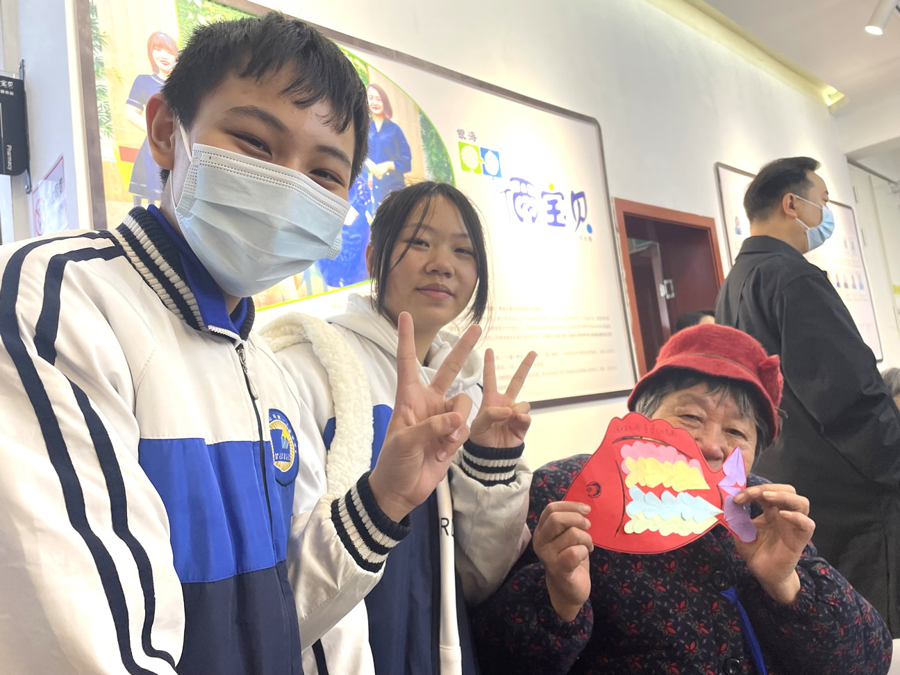 “爺爺奶奶們好!”還未瞧見(jiàn)人一聲聲清脆響亮的問(wèn)好聲便已傳了進(jìn)來(lái),在老師及工作人員的組織下同學(xué)們有序進(jìn)入到院內(nèi)并配合做好疫情防控登記。不一會(huì)兒,同學(xué)們陸續(xù)找到爺爺奶奶進(jìn)行自我介紹,并以一對(duì)一的形式來(lái)協(xié)助他們完成今天的手工作品“年年有魚(yú)”。