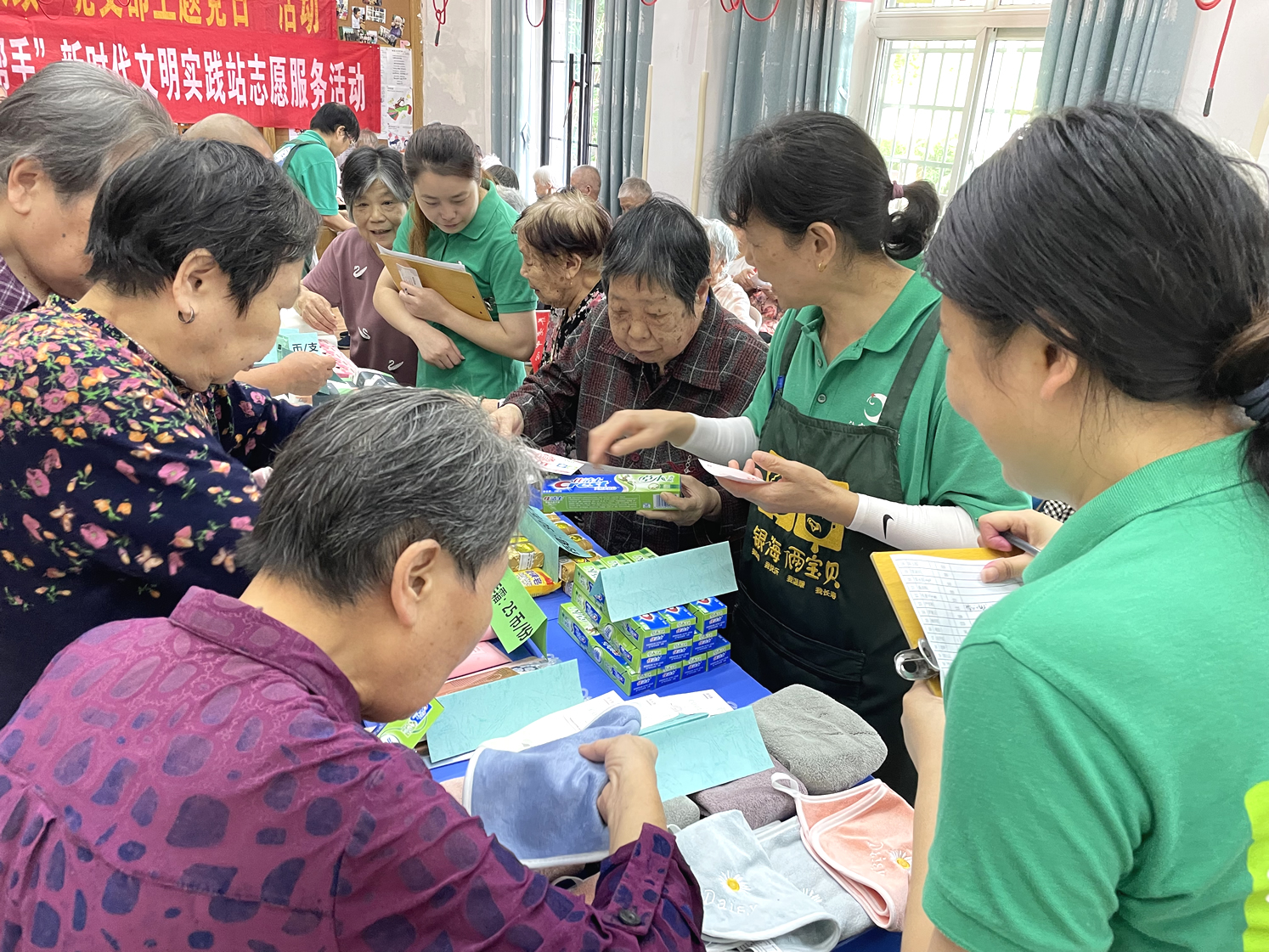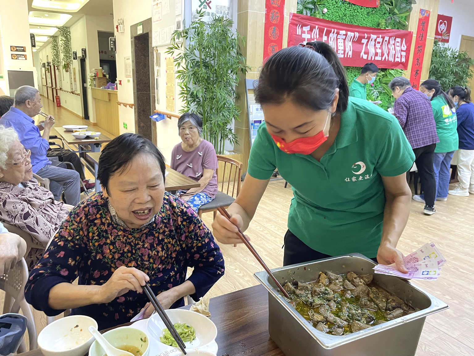 現(xiàn)場食物十分豐富,有重陽花糕臭干子、虎皮鳳爪小籠包、餛飩、蒸餃、涼面、炒粉、蒸玉米、紫薯、油條、涼拌菜、水果拼盤等美食陸續(xù)端上來,格外美味的各種小吃,種類繁多,色香味俱全。爺爺奶奶們每天吃食堂的飯菜,時不時換點新花樣,都很高興,想吃什么,用手上的幸福幣直接購買就行。爺爺奶奶們一邊感受著自己賺錢自己花的快樂一邊品嘗著喜歡的小食,整個現(xiàn)場其樂融融、熱熱鬧鬧。行動不便的爺爺奶奶們也沒關(guān)系,工作人員送到身邊隨他挑選。