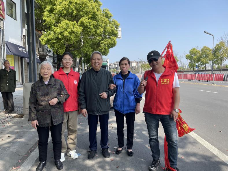 而部分乘坐輪椅不能進廟的爺爺奶奶們,則在門口休息片刻,和志愿者們一起體驗傳統(tǒng)舞龍彩帶的魅力。